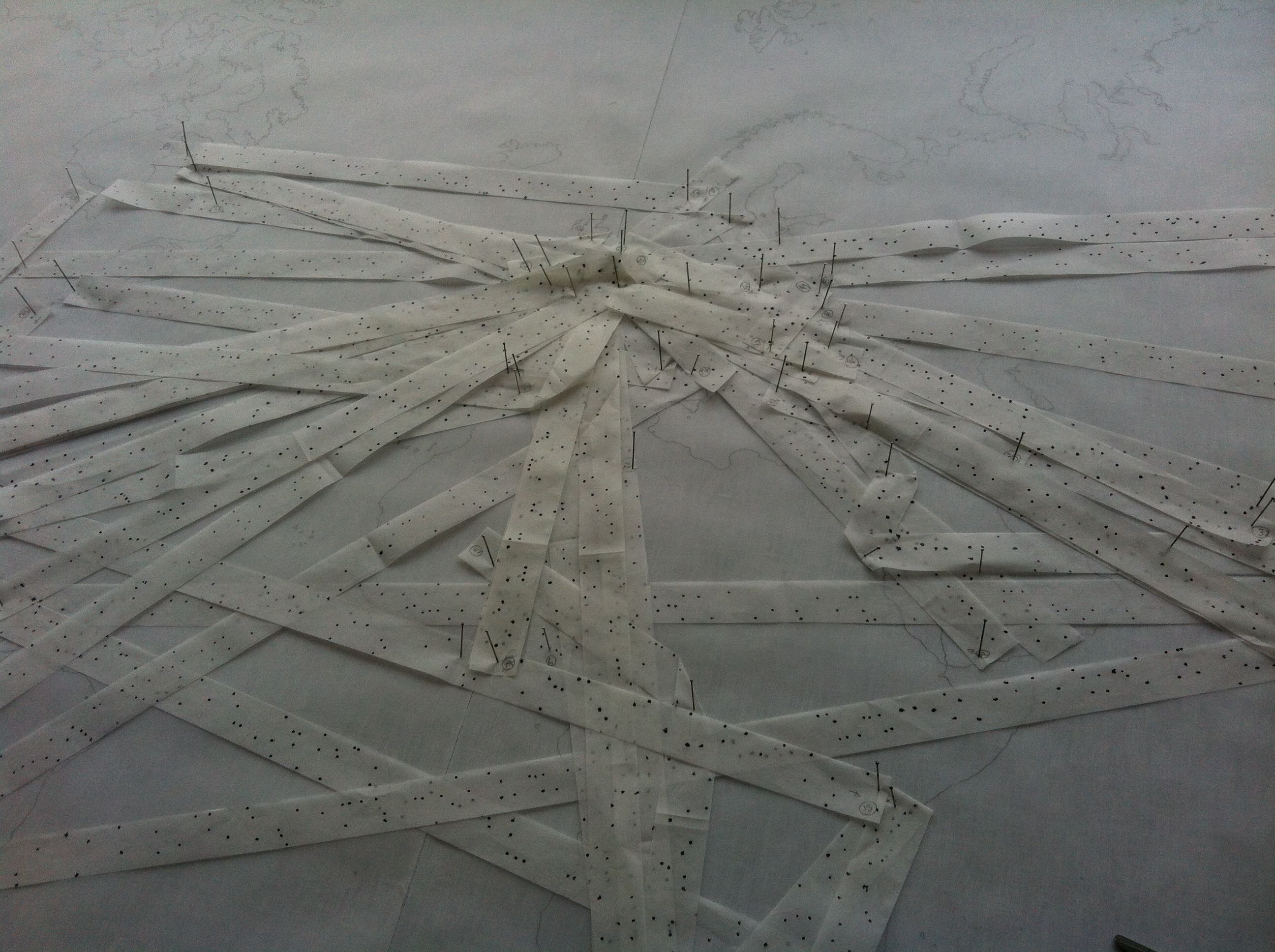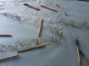 I then began to pin out the routes, using silk thread to knot around the pins. As the journeys converge and cross, a patterning of lacework will emerge. I am calling the work “Pattern Language” which relates to the idea of a design syntax, of a set of variables which can be used as a vocabulary and grammar to describe ‘solutions to problems in a field of interest’. It also relates to my interest in translation and the incoherence of the palimpsest of different histories that make up a place, the tangle of interwoven lives at any given moment.